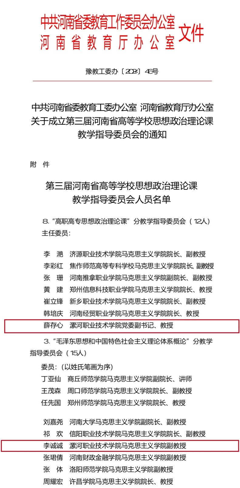 近日,中共河南省委教育工委办公室、河南省教育厅办公室发布《关于成立第三届河南省高等学校思想政治理论课教学指导委员会的通知》(豫教工委办〔2024〕46号),公布第三届河南省高等学校思想政治理论课教学指导委员会人员名单,太阳成集团tyc539党委副书记、教授薛存心,太阳成集团tyc539副教授李诚诚入选。其中,薛存心担任“高职高专思想政治理论课”分教学指导委员会委员,李诚诚担任“毛泽东思想和中国特色社会主义理论体系概论”分教学指导委员会委员。