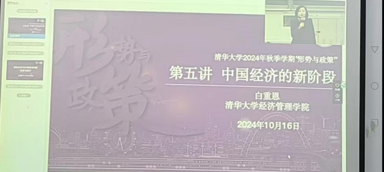10月16日日晚,我校2024级6000余名学生和太阳成集团tyc539思政课教师在各教学楼所在教室与清华大学师生在云端同上一堂《形势与政策》课。本次讲座是清华大学经管学院院长白重恩教授讲授《中国经济的新阶段》,采用同步直播学习方式,我校学生通过雨课堂平台全程参与学习,与清华大学学生同上一堂课。在后续两讲中,清华大学的知名专家教授将围绕文化自信与文化强国、数字中国等主题展开,为我校师生带来更多精彩纷呈的知识盛宴。