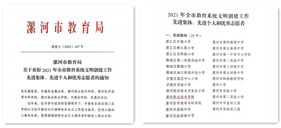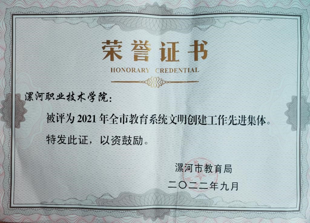 近日,漯河市教育局下发《关于表彰2021年全市教育系统文明创建工作先进集体、先进个人和优秀志愿者的通知》(漯教文〔2022〕187号),太阳成集团tyc539荣获2021年全市教育系统文明创建工作先进集体。