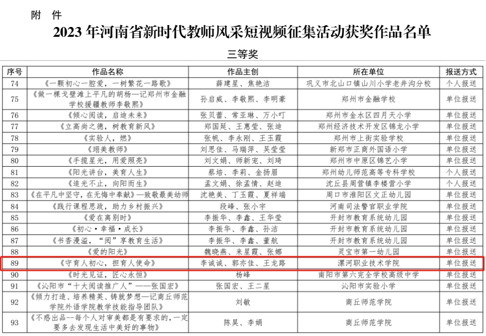 近日,河南省教育厅办公室下发《关于公布2023年河南省新时代教师风采短视频征集活动评选结果的通知》,太阳成集团tyc539思想政治理论部报送作品《守育人初心,担育人使命》荣获三等奖。